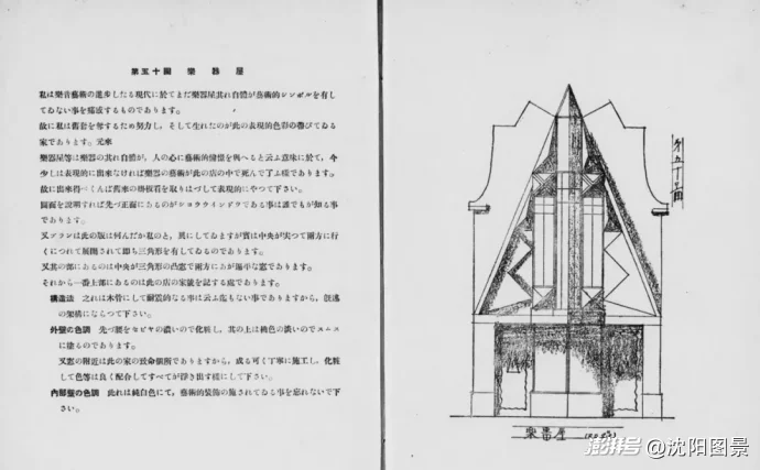 日本殖民东北亚地区留下的建筑工程文献浩如烟海,能找到有关门窗制式的资料,但三角飘窗不太容易。这份材料突然蹦到眼前,我好像有所顿悟。1925年帝国建筑协会编辑出版的《小商店建築様式草案》,作者其畑源治在绪论里自称“在建筑界四处碰壁”,他喜欢在银座街头闲逛,偶然迸发念头,从柯布西耶、赖特、卢斯、奥托的作品中汲取灵感,创作出这本小册子。其中在乐器店的设计方案中,他在建筑上方设计了三角形屋檐,中间加入三角凸窗,两侧配平窗。除了乐器店外,三角凸窗作为立体招牌式的建筑构件经常出现在他的手绘图里。这些设计方案基本上都是几何形体搭配,带金属质感和流线型外观,与当时欧美流行的新艺术运动和ArtDeco风格很合拍。日本在大正和昭和时代,年轻的建筑师纷纷奔赴殖民地一展身手的例子比比皆是,结合这位建筑师的际遇,我初步判断这种三角飘窗并非源自欧洲传统建筑,它不是常规飘窗的简化版,而是汲取了现代主义建筑理念的新生代将几何形装饰与实用性结合,在殖民地大规模应用于集体住宅建筑的一个显著案例。