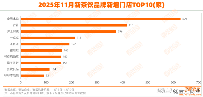 2025年11月,壹览商业监测的30个连锁茶饮品牌合计现有门店总量13.44万家,单月新开3190家、关闭2692家,净增长498家。