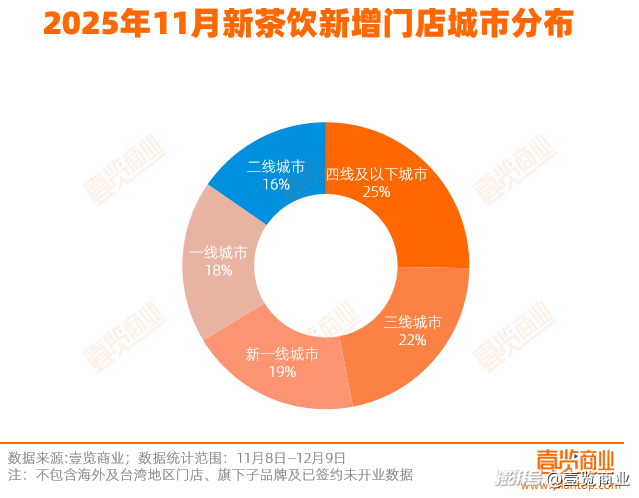 从新增门店的城市分布来看,新茶饮的门店增长重心在下沉市场,其中四线及以下城市11月新增806家门店,占当月新增门店的四分之一;三线城市表现同样强劲,新增693家门店,占比21.72%;二线城市新增占比最少,为15.39%。