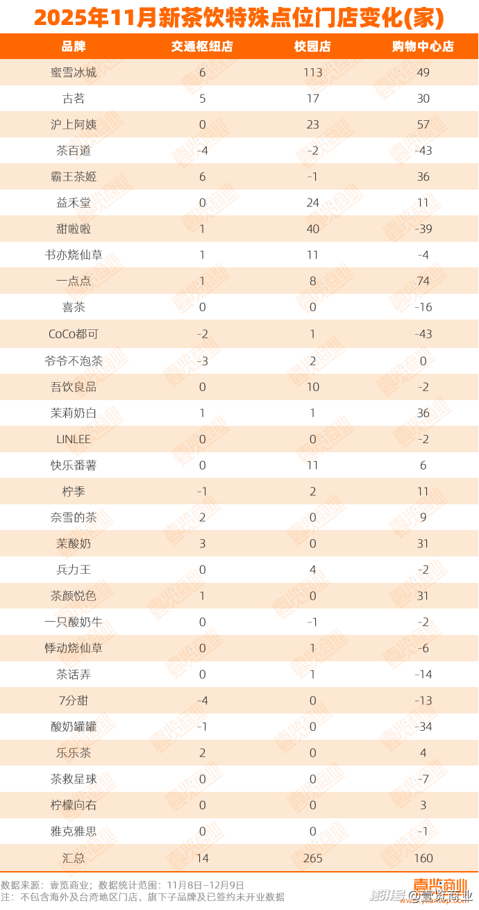 从特殊点位来看,三个特殊点位合计净增439家。校园点位合计净增265家,其中,蜜雪冰城开店最多为113家,与甜啦啦的40家,为校园店的增长贡献超过一半。