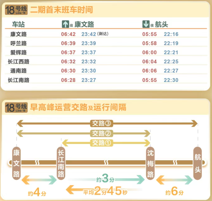 此次18号线二期开通初期运营后,康文路站将作为18号线二期终点站。首末班车:康文路站发往航头站方向的首班车时间为5:55 ,末班车时间为22:16。同时,原18号线一期终点站长江南路站调整为途经站,首末班车:长江南路站往航头站方向首班车时间为5:55 ,末班车时间为22:30;长江南路站往康文路站方向首班车时间为6:28 ,末班车时间为23:27。