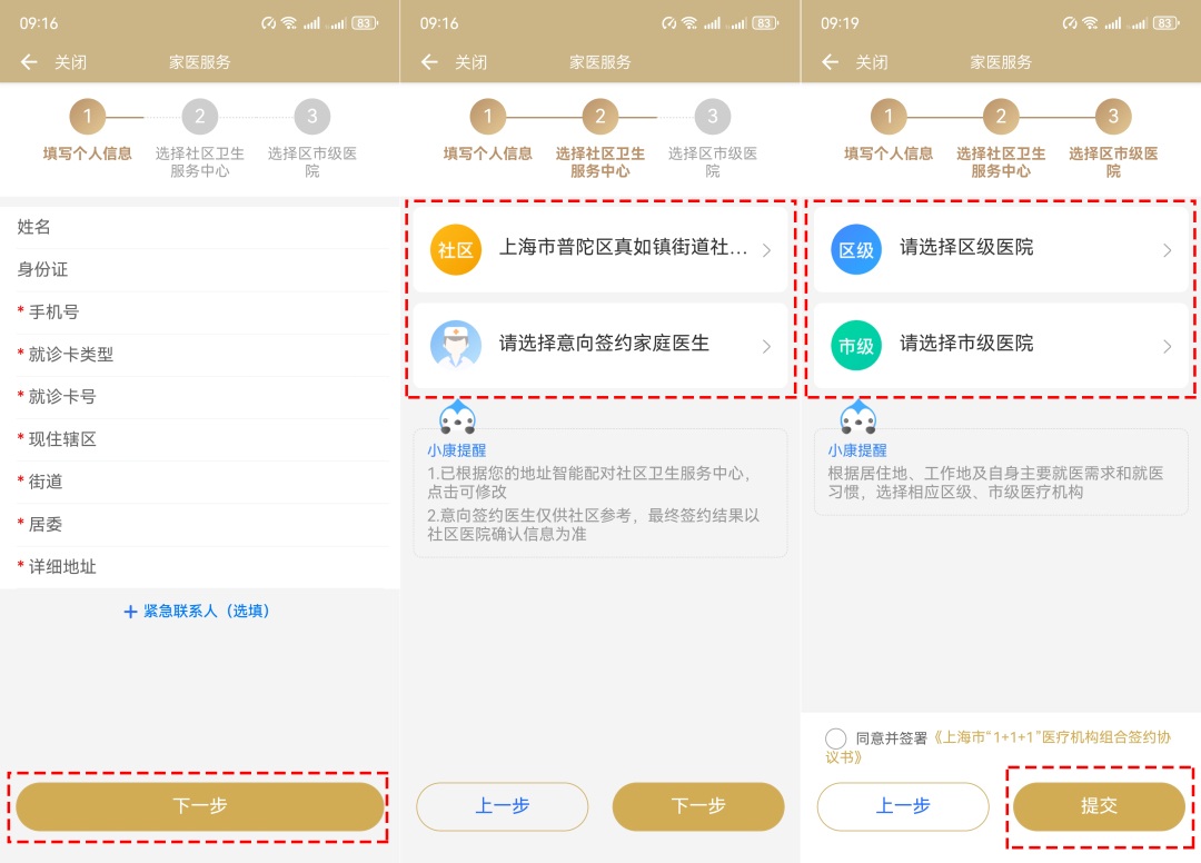 2、完善个人信息并添加紧急联系人信息,点击“下一步”→选择社区卫生服务中心,并选择意向签约家庭医生→选择区级和市级医院,同意并签署协议书后,点击“提交”,即可完成申请。