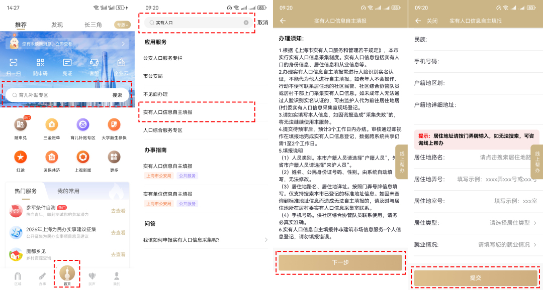 登录“随申办市民云”APP→首页搜索框中输入关键字“实有人口”→点击“实有人口信息自主填报”→输入自己或家人信息并提交即可。