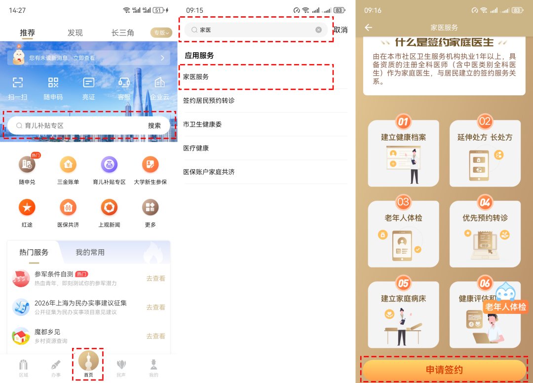 1、登录“随申办市民云”APP→首页搜索关键词“家医”→点击“家医服务”进入申请页面→点击“申请签约”;