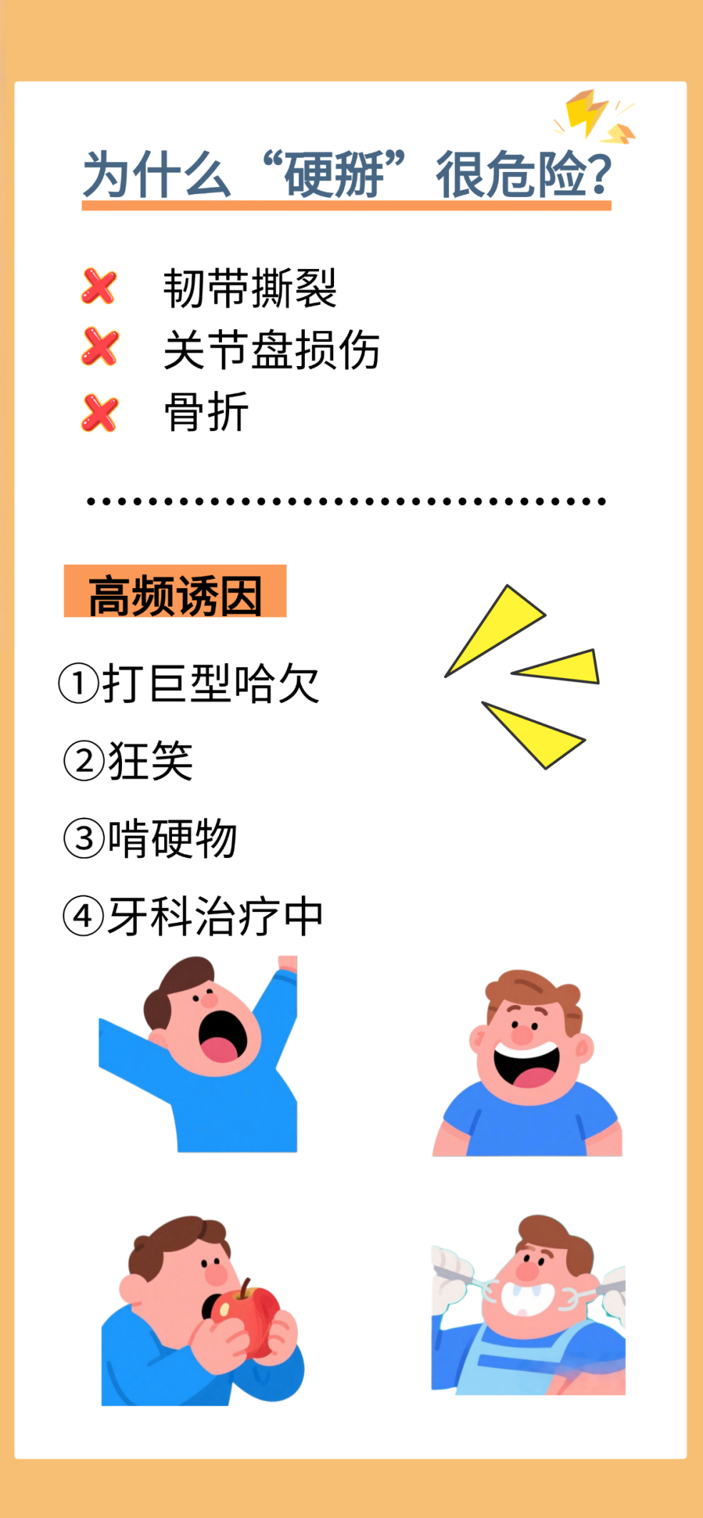 打哈欠、吃东西或说话时,突然听到“咔哒”一声,下巴便动弹不得,伴随一阵刺痛,甚至直冒冷汗——这很可能就是颞下颌关节脱位,俗称“掉下巴”。这种情况往往发生得猝不及防,但若处置不当,不仅会加重疼痛,还容易反复发作,严重影响咀嚼、说话等日常功能。