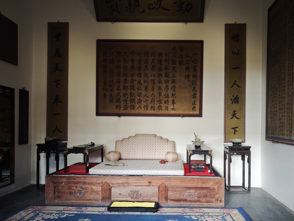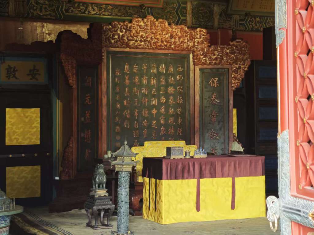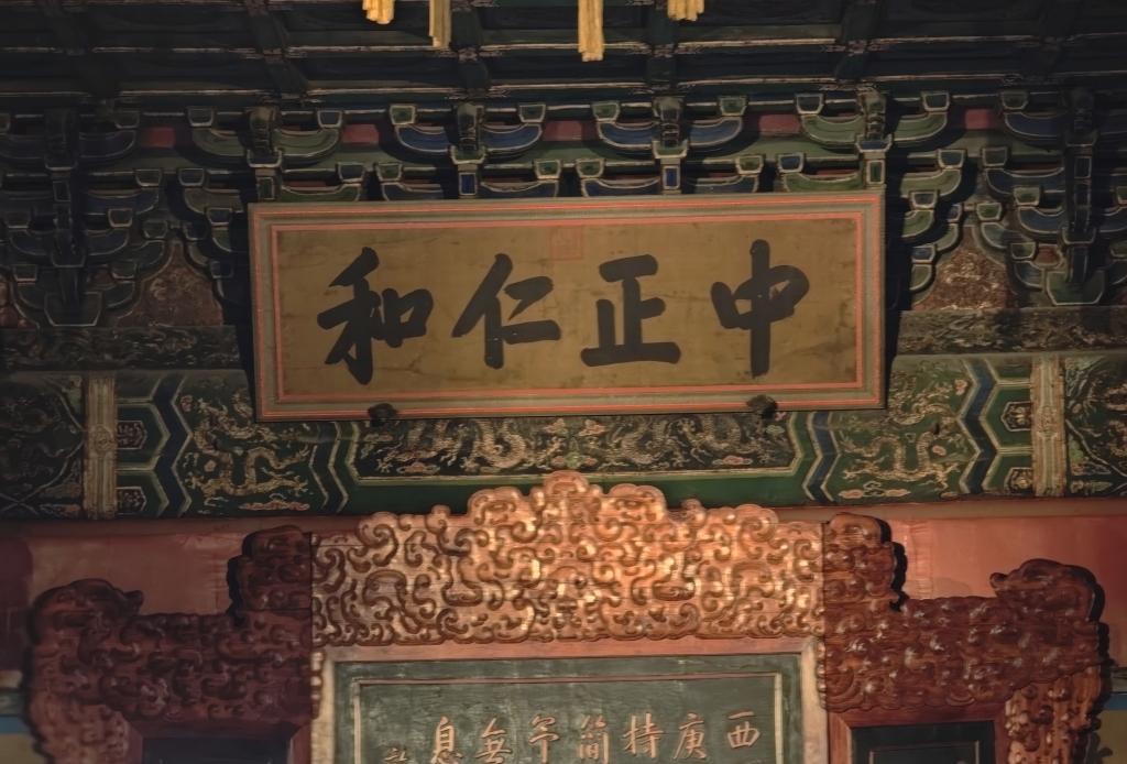 皇帝的宝座设在明间正中,安设于“地平”(高起的木制平台)之上,构成整个空间的视觉中心与权力中心。宝座正上方悬挂着雍正皇帝御笔亲书的“中正仁和”匾,阐明了为君之道的核心理念。宝座后方设屏风,其上对联“保泰常钦若、调元益懋哉”为乾隆皇帝御题。宝座周围按宫廷朝仪规范,陈设有香筒、几案、翎扇等器物。