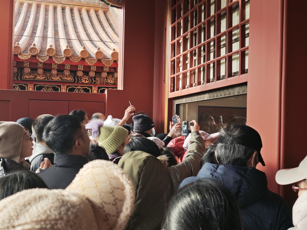 养心殿位于内廷乾清宫西侧,其主体建筑院落南北长约62.6米,东西宽约81.3米,占地约5100平方米,包括养心殿正殿、工字廊、后殿等建筑。穿过养心门的院落里人头攒动,纷纷挤向前前排拍照。目前完整复陈、向大众呈现的主要有正殿与第二进院落中的体顺堂。