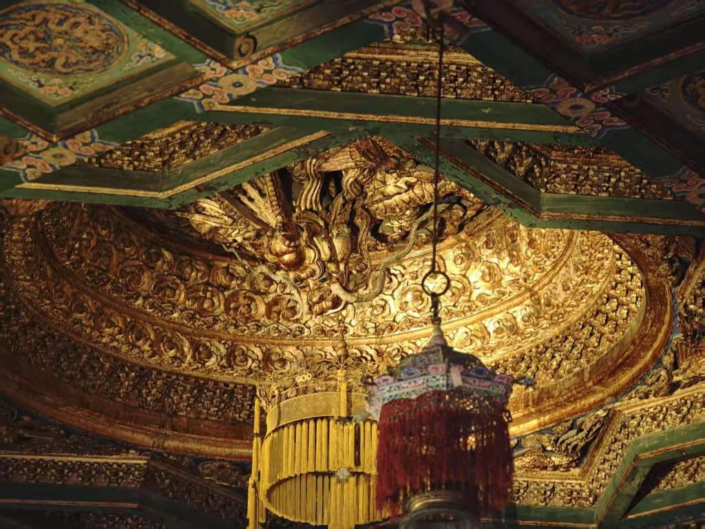 明间梁架内藻井正上方,曾供奉有刻镇宅灵符的铜质镇物。天花板处装饰着贴金双龙天花,中央位置则是八角形蟠龙衔珠藻井,藻井内的蟠龙造型栩栩如生,口衔宝珠,周身贴金,在光影映衬下尽显皇家规制的恢弘大气。