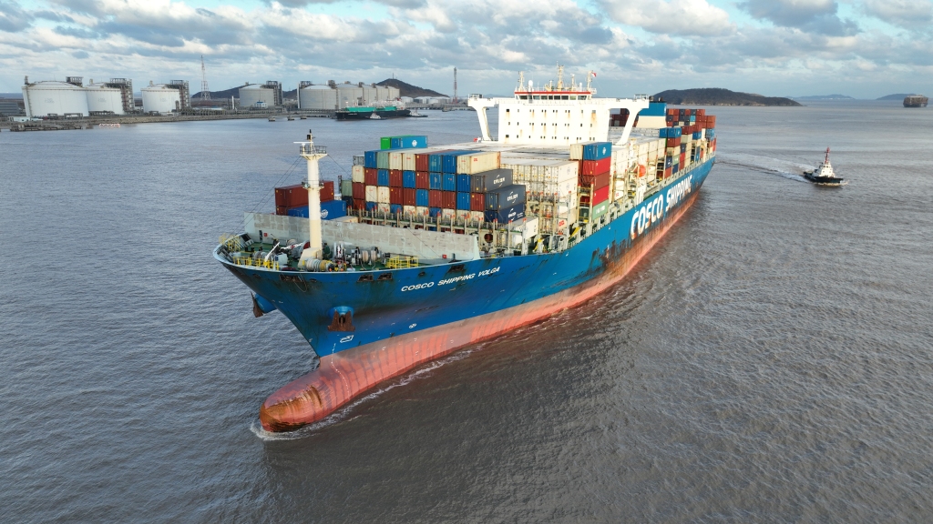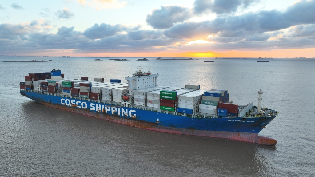 中远海运伏尔加河轮载运南半球农产品靠泊洋山港,在港期间将卸下智利车厘子2.1万吨 上海洋山边检 供图