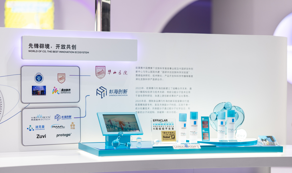 重视研发是全球美妆品牌发力市场的重要方向之一,其不仅是品牌实力的展现,也是吸引消费者的关键所在。理肤泉与杉海创新联合研发的独家专利共体超分子B5+红没药醇成分成为了当前的热门成分。所谓共体超分子,其实是一种基于超分子化学原理的创新技术,其核心在于通过非共价键(如氢键、范德华力等)将多个分子精准组合成具有特定功能的复杂结构,该过程类似于乐高拼搭,有助于突破单一成分功效。而雅诗兰黛的胶原建模科技则以全皮层胶原构建为卖点,通过关键胶原的协同作用来满足消费者的护肤需求。