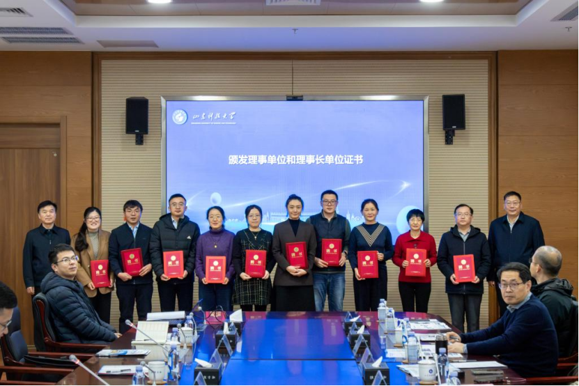 会上,研究生院与学科建设办公室负责人韩作振宣读联合体第一届理事会名单。山东科技大学当选为理事长单位,北京星天科技有限公司、中国海洋大学等23家单位担任理事单位。诸葛福民与韩作振共同为理事单位颁发证书。