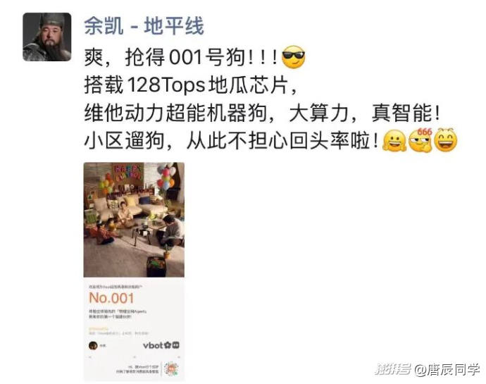 地平线创始人兼CEO余凯,更是在预售启动第一时间即抢下001号订单,地瓜机器人CEO王丛也晒出订单并确认,Vbot搭载了其自研的S100P芯片。