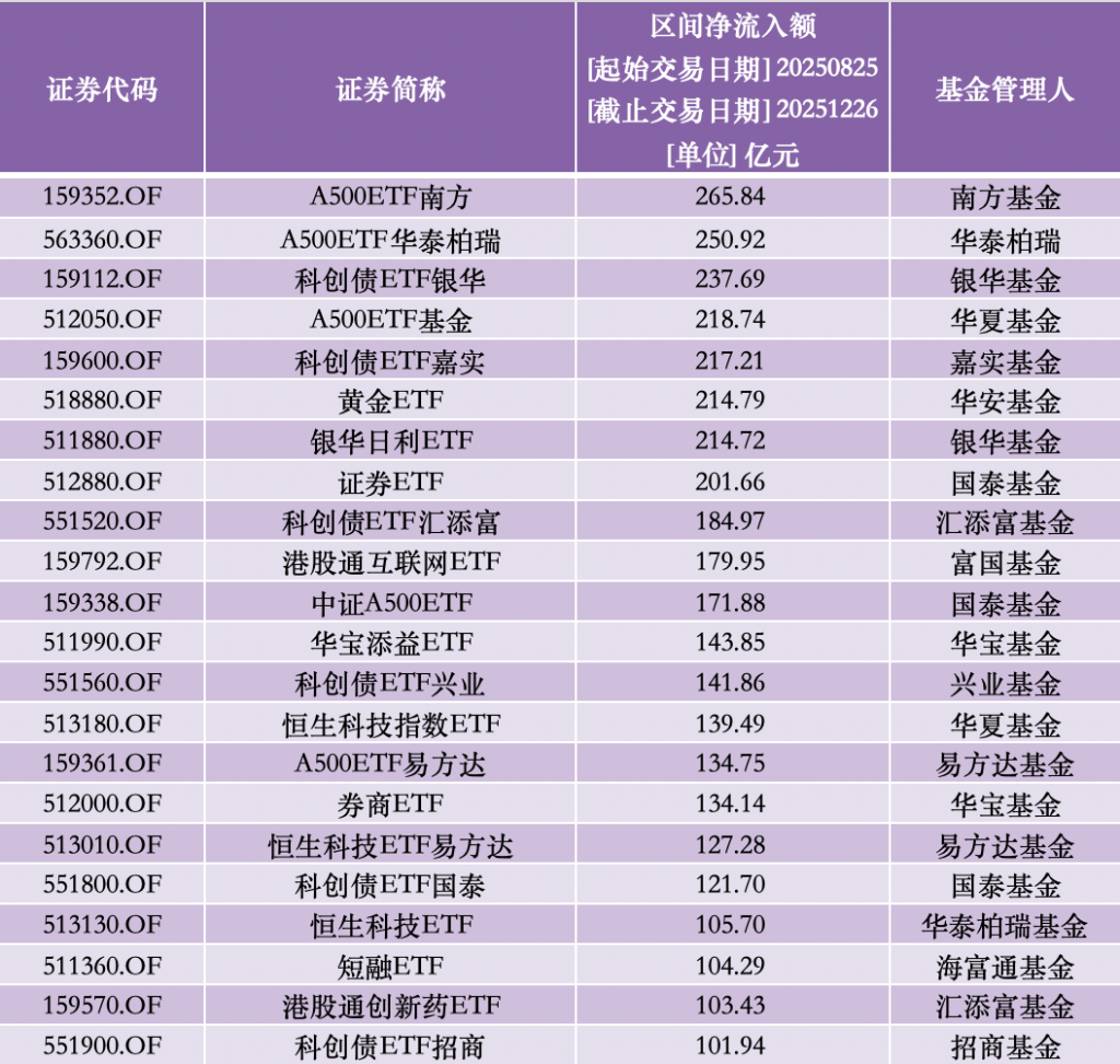 例如,华安黄金ETF、国泰证券ETF的累计净流入额分别为214.79亿元、201.66亿元;富国港股通互联网ETF、华夏恒生科技ETF、华宝券商ETF、易方达恒生科技ETF、华泰柏瑞恒生科技ETF的累计净流入额也均在105亿元以上。