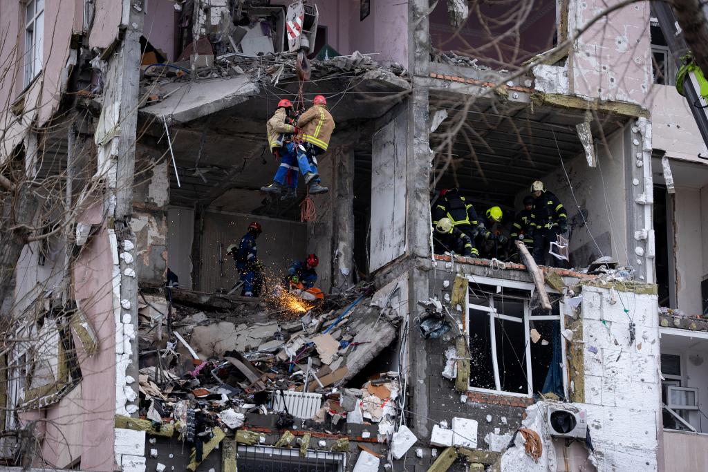 当地时间2025年12月27日,乌克兰基辅,救援人员清理一栋18层住宅楼的废墟。视觉中国 图