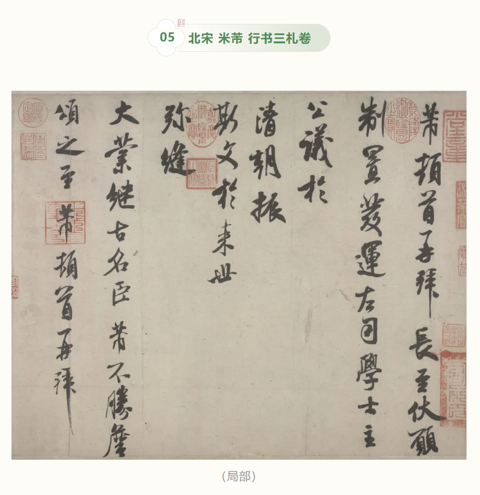 江西省博物馆方面介绍:此卷为米芾三封书信合裱而成。《长至帖》为夏至日祝颂同僚仕途之作。《韩马帖》记录商借唐代韩幹鞍马图事宜。《新恩帖》系恭贺新任吏部侍郎的信函。三札皆系米芾五十岁后的晚期作品,神完气足,炉火纯青,个人风格已十分成熟。