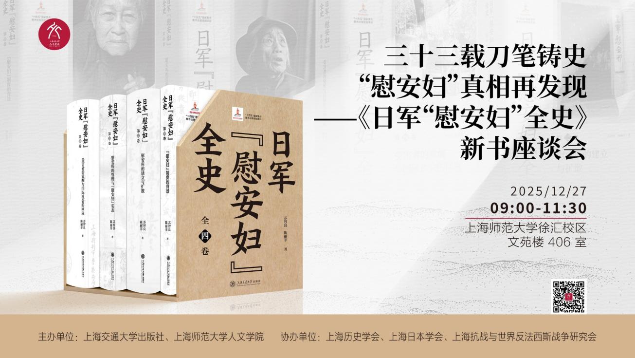 在纪念中国人民抗日战争暨世界反法西斯战争胜利80周年之际,由上海师范大学苏智良、陈丽菲教授撰作的《日军“慰安妇”全史》,以216万字的篇幅,为曾被深深掩藏的二战日军暴行史中的“慰安妇”问题研究领域,贡献了一部厚重的全景式著作。12月27日上午,《全史》新书座谈会由上海交通大学出版社、上海师范大学人文学院主办,上海市历史学会、上海市日本学会、上海抗战与世界反法西斯战争研究会共同协办,在上海师范大学隆重举行。