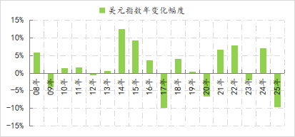 虽然美元指数在2025年的半年跌幅和全年跌幅均排进了其历史记录的前10,但在布雷顿森林体系瓦解后,美元指数只在“广场协议”后的1985-1987年期间出现过持续且大幅下跌的行情,而2008年金融危机以来,美元指数尚未出现过连续2年下跌的行情。美元能否在2026年打破这个惯例——出现连续两年下跌,尚待市场的验证。从过往的经验来看,每当市场预期高度一致的时候,出现反预期变化的概率并不低。