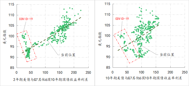 鉴于美元还处在降息周期内,而特朗普本人一直要求美联储重返低利率环境,所以市场基于美元与非美货币的利差还将收窄的判断,而看空2026年的美元。从数据实况来看,除了新冠疫情最严重的阶段,美元与非美货币之间的利差确实与美元指数存在一定相关性,收窄的利差可能给美元形成压力,不过实际压力有多大,则不一定——这一点是2025年美元给我们最大的启示,也是我们最需要反思的(2025年美元并未如我们预期那样下跌)。例如,目前利差与美元的位置已经回到趋势线附近,2年、10年的利差分别在108BPs与80BPs的水平,已低于今年9月美元下探97下方低位时的水平,换而言之,利差的收窄并没有给美元造成新的压力。