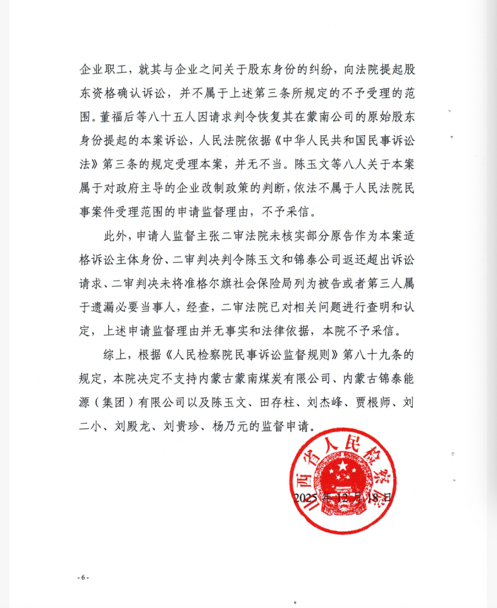 综上,山西省人民检察院决定不支持内蒙古蒙南煤炭有限公司、内蒙古锦泰能源(集团)有限公司及陈玉文等8人的监督申请。