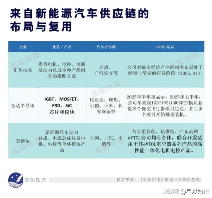 汇川技术、英搏尔、斯达半导体等企业,原本深耕于新能源车的电驱与功率电子模块,如今也陆续获得多个eVTOL项目定点,部分型号已进入批量装机阶段。点击下图可放大