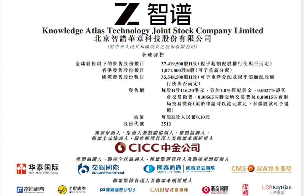 12月30日,北京智谱华章科技股份有限公司(以下简称“智谱华章”)正式开启港股招股,至2026年1月5日结束,并计划于2026年1月8日正式以“2513”为股票代码在港交所主板挂牌上市。公司拟全球发售3741.95万股H股,其中香港公开发售187.1万股H股,国际发售3554.85万股H股。