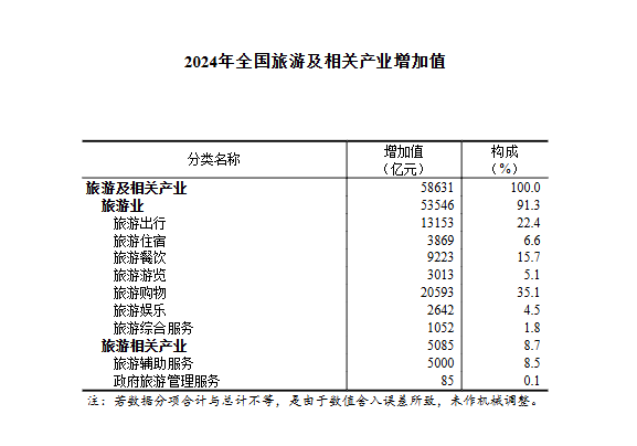 经核算,2024年全国旅游及相关产业增加值为58631亿元,占国内生产总值(GDP)的比重为4.35%,比上年提高0.11个百分点。