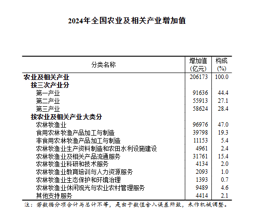 从农业及相关产业大类看,农林牧渔业、食用农林牧渔产品加工与制造、农林牧渔业及相关产品流通服务增加值规模居前三,占农业及相关产业增加值的比重分别为47.0%、19.3%、15.4%。