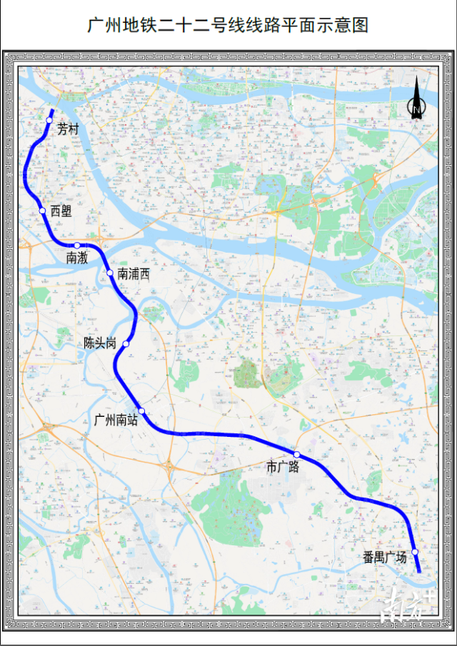 22号线全长29.7公里,设车站8座,分别为芳村站、西塱站、南漖站、南浦西站、陈头岗、广州南站、市广路、番禺广场。其中,22号线首通段(番禺广场-陈头岗)已于2022年3月31日开通运营。