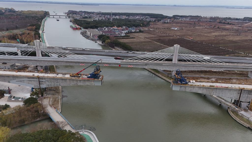 1月1日早上7点,上海市域线示范区线4标跨拦路港大桥建设现场热火朝天,伴随着机械轰鸣声,建设者正全力以赴推进施工,冲刺本月中旬的大桥合龙目标。