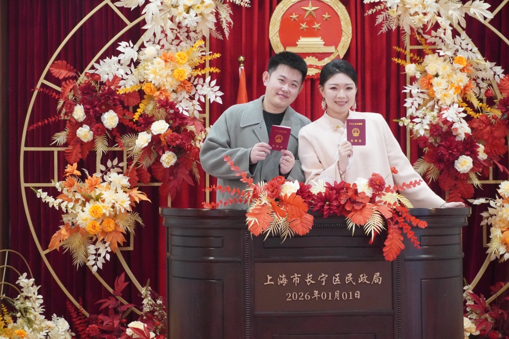 2026年1月1日,幸福从头开始。早上9点10分左右,冯先生和王女士成为首对在上海幸福路颁证台宣誓缔结姻缘的新人。而今天,也正是上海长宁区民政局婚姻登记处整体搬迁至幸福路50号的正式开放首日。