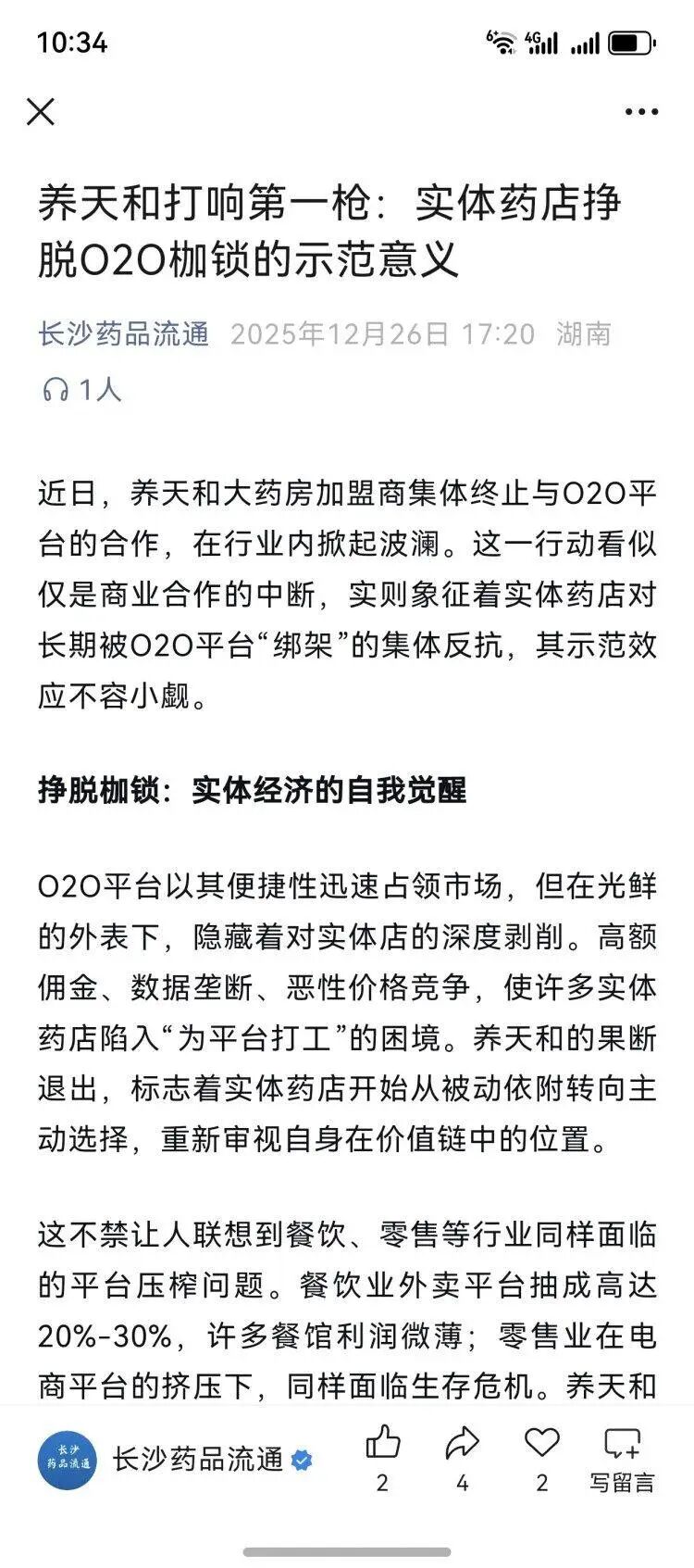 除在自家社交平台上发声外,12月26日,长沙市药品流通行业协会微信公众号上刊发文章《养天和打响第一枪:实体药店挣脱O2O枷锁的示范意义》。文章开头写道:“近日,养天和大药房加盟商集体终止与O2O平台的合作,在行业内掀起波澜。这一行动看似仅是商业合作的中断,实则象征着实体药店对长期被O2O平台‘绑架’的集体反抗,其示范效应不容小觑。”