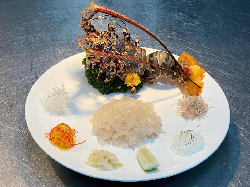 还有一类就是高档刺身宴上的得力配角“海鲜粥”,如“象拔蚌粥”“龙虾粥”等。在顺德吃生是一大流派,除了有名的顺德鱼生,还有高档的海鲜类刺身吃法,这类吃法,食材主要是深海的象拔蚌、龙虾、鲍鱼、海鱼等。这类吃法的主体是蚌肉、龙虾肉和海鱼肉,是蘸味的生吃。头尾等被顺德厨师巧妙地用来煲粥,使这些名贵海鲜食材的每个部位都体现独特价值,既不浪费,还生猛犹在,风味独具。这类生猛海鲜粥的特点,就是粥体鲜味特别浓郁,海鲜食材的头尾肉质嫩滑清甜。这类粥的烹制,先将粥体熬好,待吃生接近尾声时,将海鲜食材的头尾等放入粥体生滚,生滚要注意火候,不宜大火快火猛攻,这类粥体要熬得相对黏稠,使粥体能裹住海鲜食材,锁住鲜味的同时,避免肉质变老。