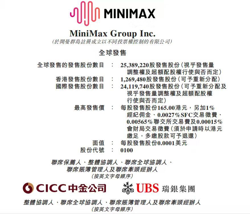 12月31日,澎湃新闻记者查阅招股书显示,MiniMax本次IPO拟发行2538.9万股,定价区间为151至165港元/股,在不考虑发售量调整权及超额配股权行使的情况下,发行估值将介于461.23亿港元至503.99亿港元之间,将于1月9日正式登陆港股资本市场,港股代码0100。