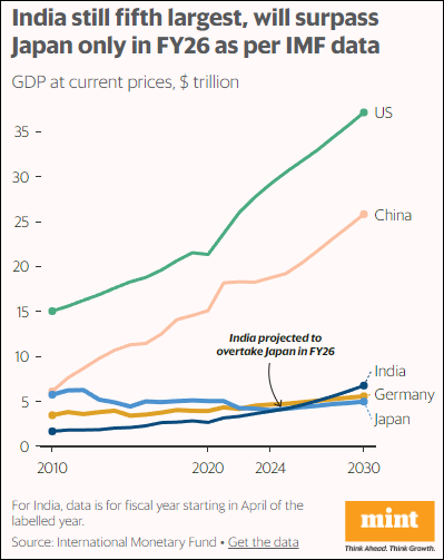 根据IMF的预测,印度目前其实仍为世界第五大经济体,超越日本可能要到2026财年实现。 MINT