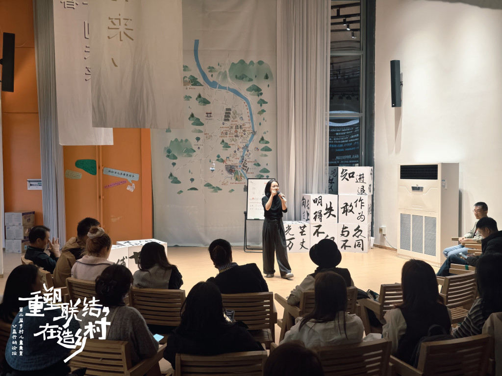 美育网络社群运营官袁颖君回忆,“重塑联结·在造乡村”的论坛主题一年前就定下了。去年九月,网络二十多位执委和社群伙伴齐聚一堂,思辨美育在促进人与人、人与系统关系联结中的价值,以及未来公益在协同合作中的趋势,为本届论坛“寻根定魂”。开幕式上,浙江致朴公益基金会执行理事长兼秘书长骆筱红也在解释了“在造”的用意。“‘在’字在甲骨文中,形如一株小草,向上刚刚冒尖,向下深深扎根,表达的是‘植物在土地生⻓’的状态。它代表我们正与乡村、儿童和同行者一起共同创造新的未来。”