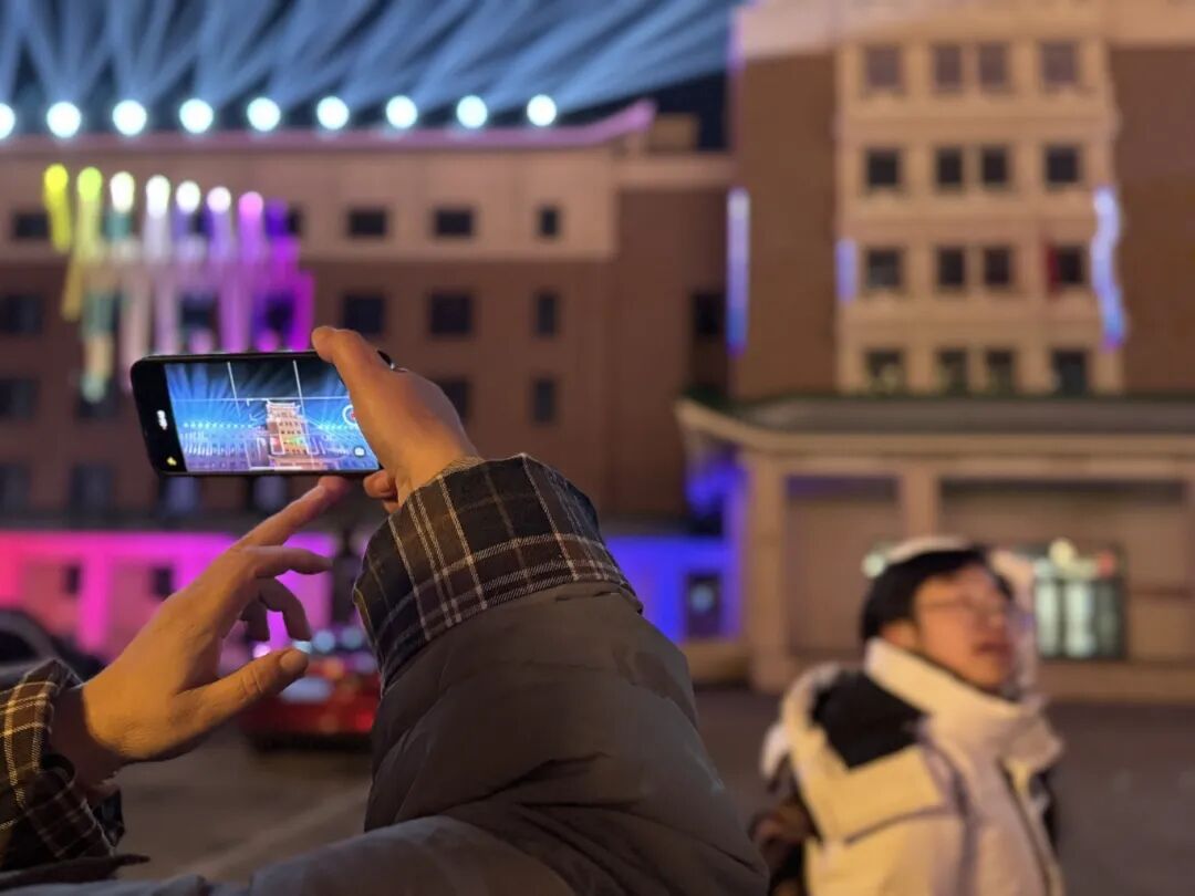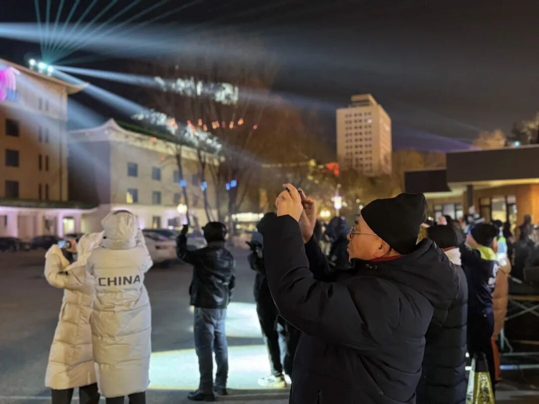 夜色渐深,光影暂歇,观众仍驻足回味。他们三三两两聚在街角,或低声交流着刚才光影变幻中印象最深的片段,或翻看着手机里记录下的精彩瞬间,脸上洋溢着意犹未尽的笑容。寒风中,长街两侧的路灯散发着温暖的光晕,与人们心中因这场光影秀而燃起的对长春的热爱相映,久久不散。
