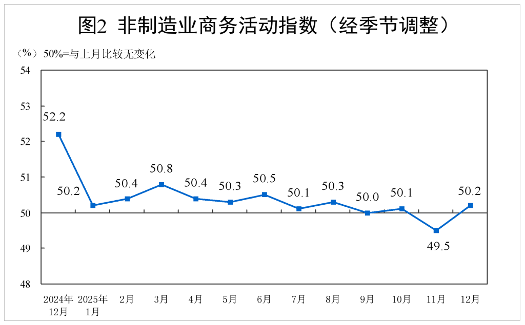 12月份,非制造业商务活动指数较上月上升0.7个百分点至50.2%,重回扩张区间。