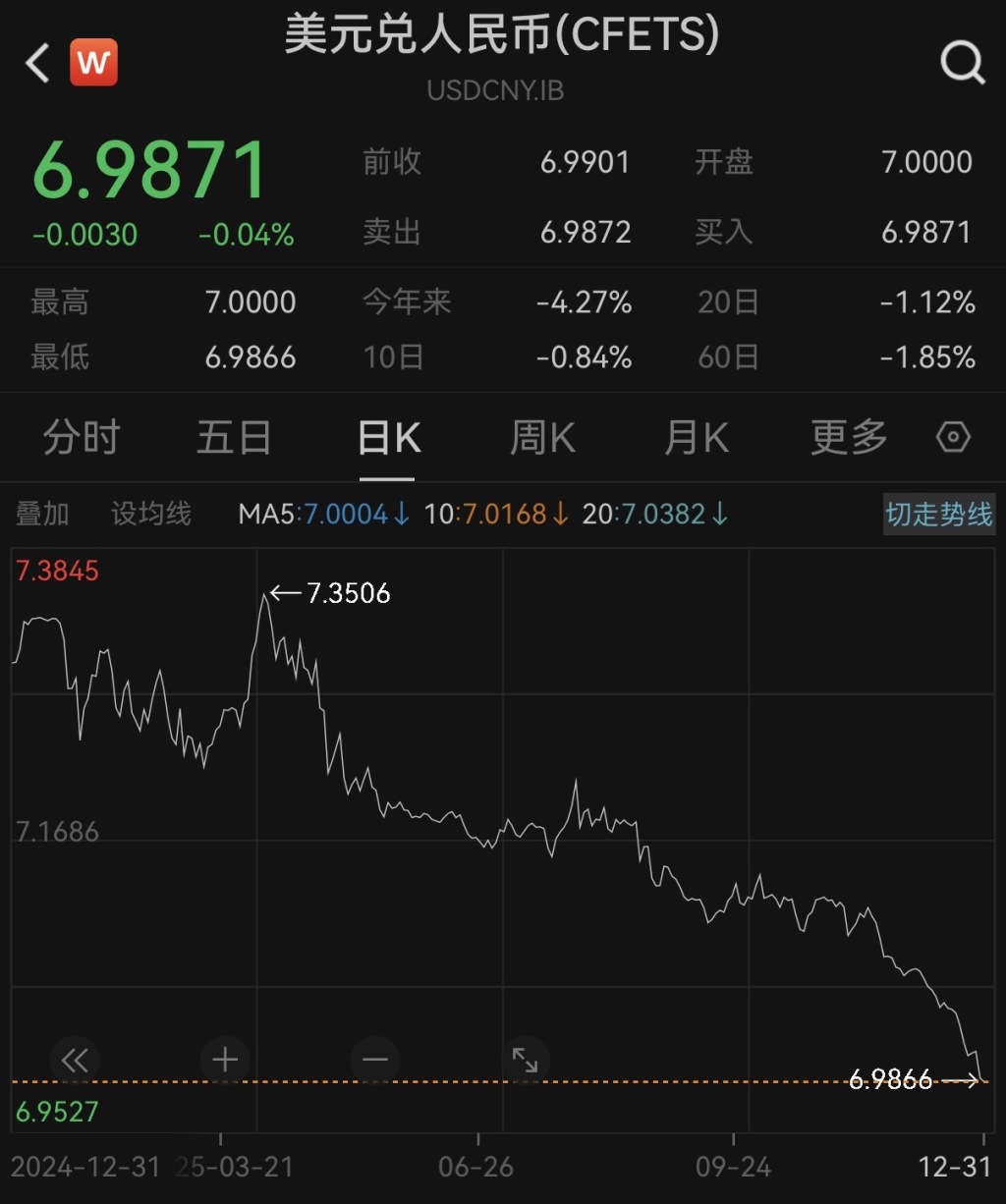 2025年的最后一个交易日,人民币对美元即期汇率16时30分收盘报6.9890,较上一交易日上涨11个基点,这一收盘价为年内最高。