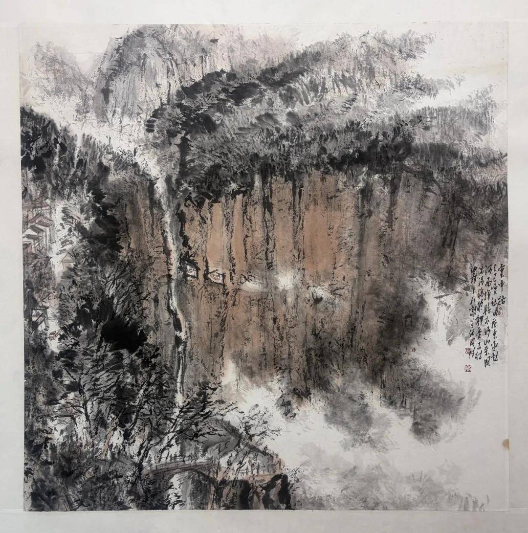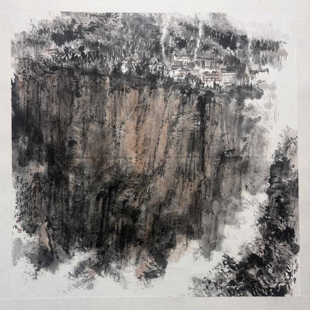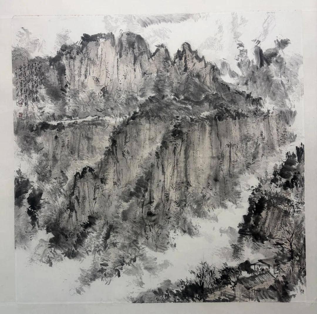 画郭亮村的石屋时,我改用秃笔中锋。那些垒在悬崖边的房舍,与其说是建造,不如说是从山体里生长出来的结石。笔触需沉涩,像老农握钎的手腕一样有不容退让的倔强。而真正考验笔力的,是表现“壁挂公路”那些凿痕——我尝试将毛笔侧锋如凿子般抵住纸面,逆锋推行,让宣纸纤维微微突起,形成类似岩石崩裂的肌理。那些长短不一的凿痕,在画面中成为最震撼的笔触语言:不是描绘,而是刻写。