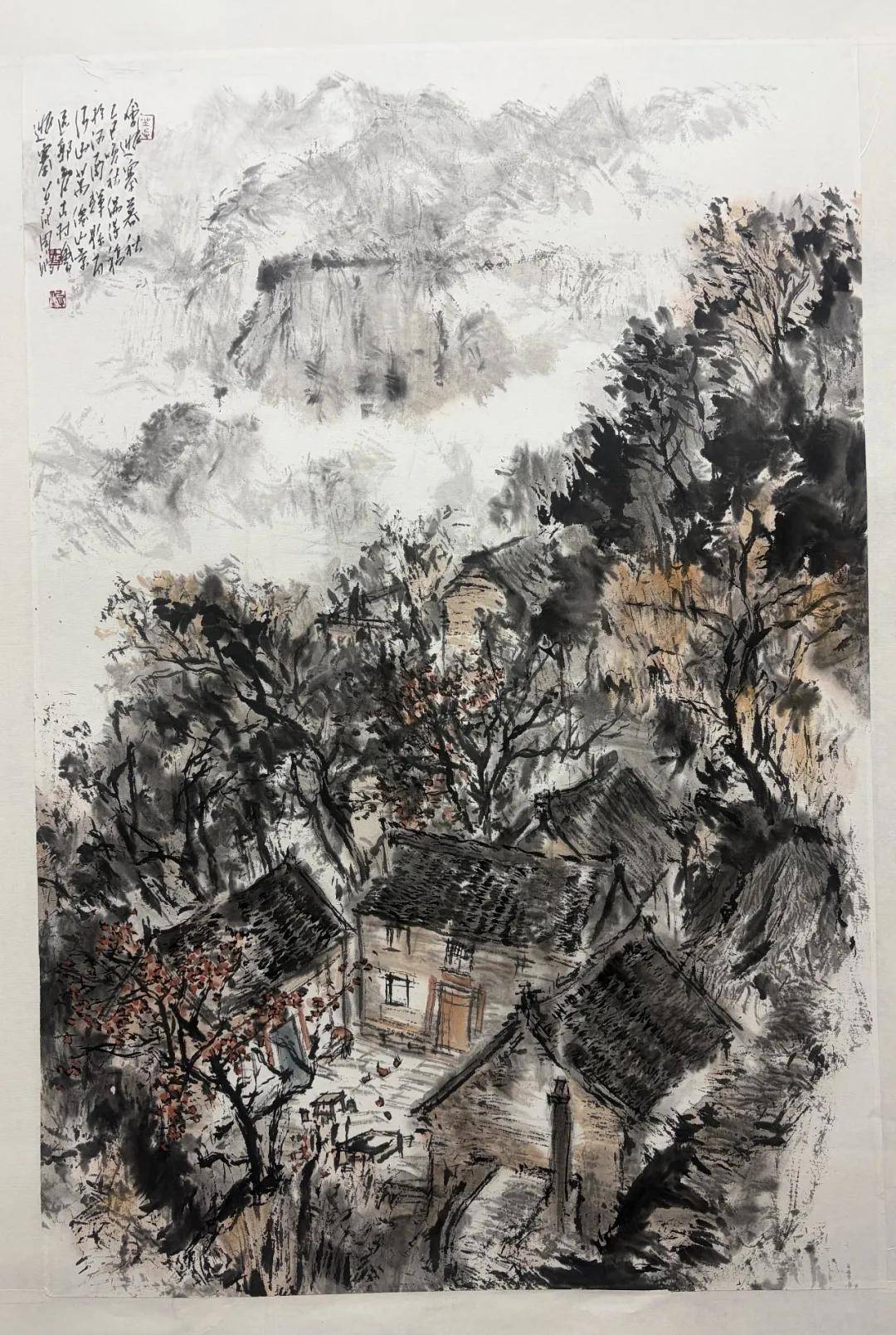 研墨时特意调淡了秋阳的金黄,以赭石打底,再以淡墨层层罩染。太行山的秋不是江南的明净,而是岩石与植被较量了亿万年后达成的凝重妥协。远山用枯笔擦出嶙峋骨架,近处的山楂树却要用饱满的赭红点染——那些挂在三百米高空的红,是人类在绝境中点燃的灯火。最难的是表现山体的体积感:它不是柔软的土山,而是整块抬升的地壳断面,必须以斧劈皴结合折带皴,让笔锋如地质运动般横向推挤、纵向断裂。