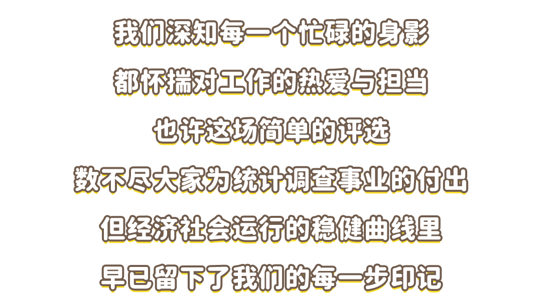 在单位,总有人检查系统、维护平台、整理文档、做好各项保障,为一切统计调查工作顺利开展铺平道路;总有人对着电脑一遍遍打磨会议文稿;总有人把周末过成工作日的延伸……请为你身边那位默默奉献、发光发热的同事鼓掌!