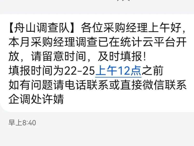 在描绘经济冷暖的统计地图上,还有另一群至关重要的“测绘师”——他们负责采购经理调查报表的催报与指导:在每月22-25日期间,全国数以万计的企业需要在线填报问卷,任何一家延迟,都可能成为链条上的“堵点”。提醒企业及时填报,关注企业指标理解与数据准确性是采购经理调查人的重要目标!