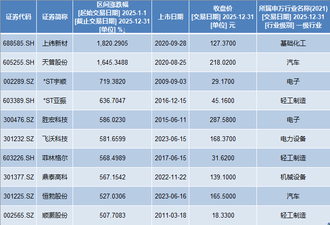 A股2025年收官:540股翻番,上纬新材涨超18倍夺冠