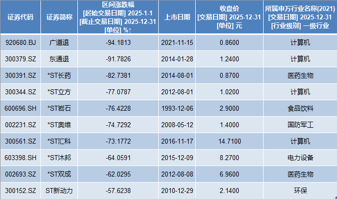 其中,广道退(920680)领跌2025年A股市场,累计下跌94.18%。东通退(300379)2025年跌幅同样超过90%,累计下跌91.78%。