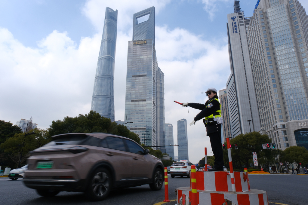 上海市公安局浦东分局交管支队东方明珠女警中队民警在世纪大道浦东南路口指挥疏导。 本文图片均为 上海市公安局 提供