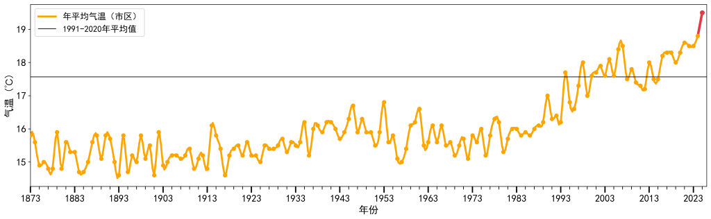 2025年,市区连续高温日数达27天,打破1926年创下的连续24天最长纪录。全年高温日数累计54天,为历史第二高值,仅次于1934年的55天;其中,6月、8月和9月的高温日数分别为9天、27天和8天,均创下各月历史新高。
