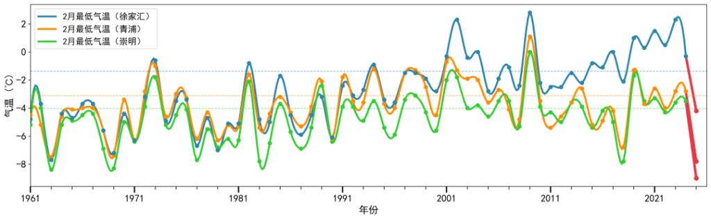 2025年2月8日-9日,上海遭遇强寒潮,全市11个国家基本气象站的日极端最低气温在-4.2℃~-9.0℃之间;其中青浦和崇明两站日极端最低气温分别达-7.8℃和-9.0℃,均打破其1961年建站以来2月极端最低气温纪录。市区日最低气温降至-4.2℃,为1991年以来的2月新低。