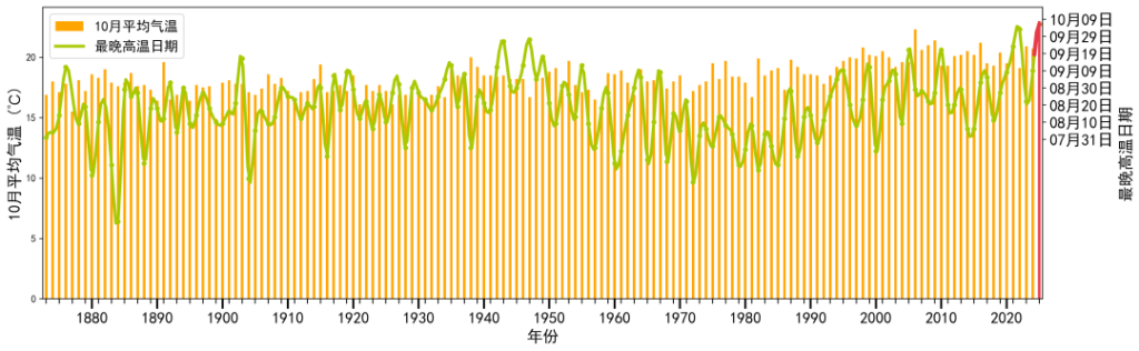 2025年10月,市区月平均气温达23.0℃,为1873年以来最高;10月6日的极端最高气温为35.0℃,创下历史最晚高温纪录。徐家汇站最晚高温出现时间及10月平均气温