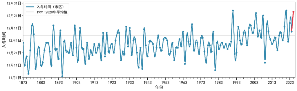 12月以来,冷空气较弱,上海气温持续偏高,直至12月24日才进入气象意义的冬天(连续5天日平均气温低于10℃),为1873年以来历史第二晚(仅早于1991年和2021年的12月25日)。