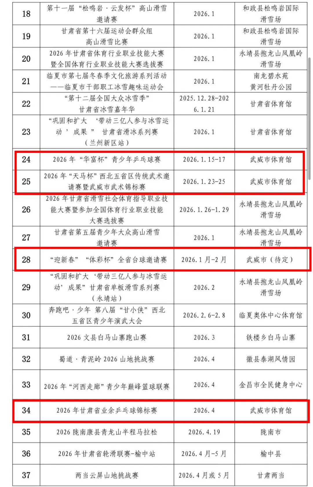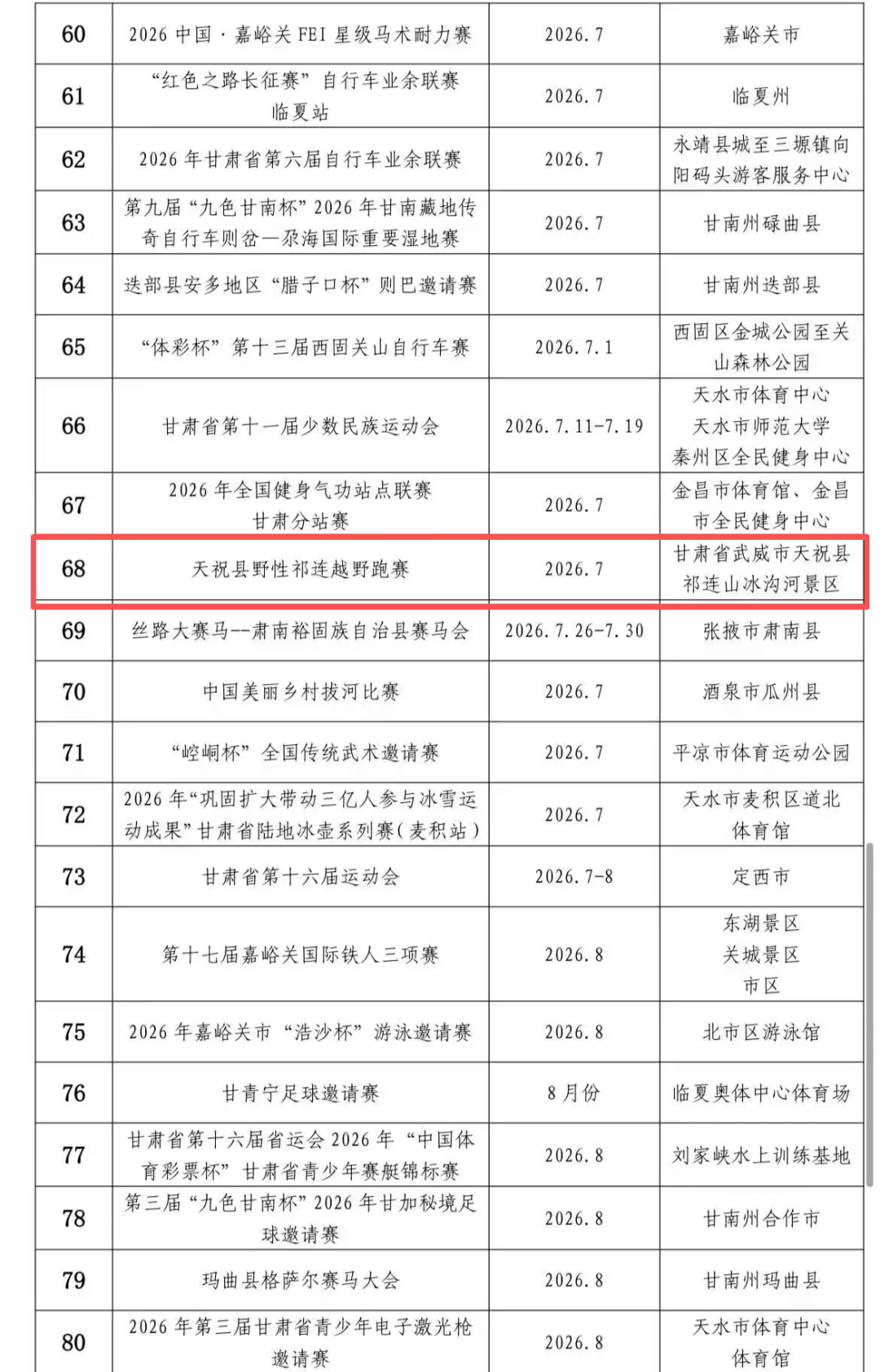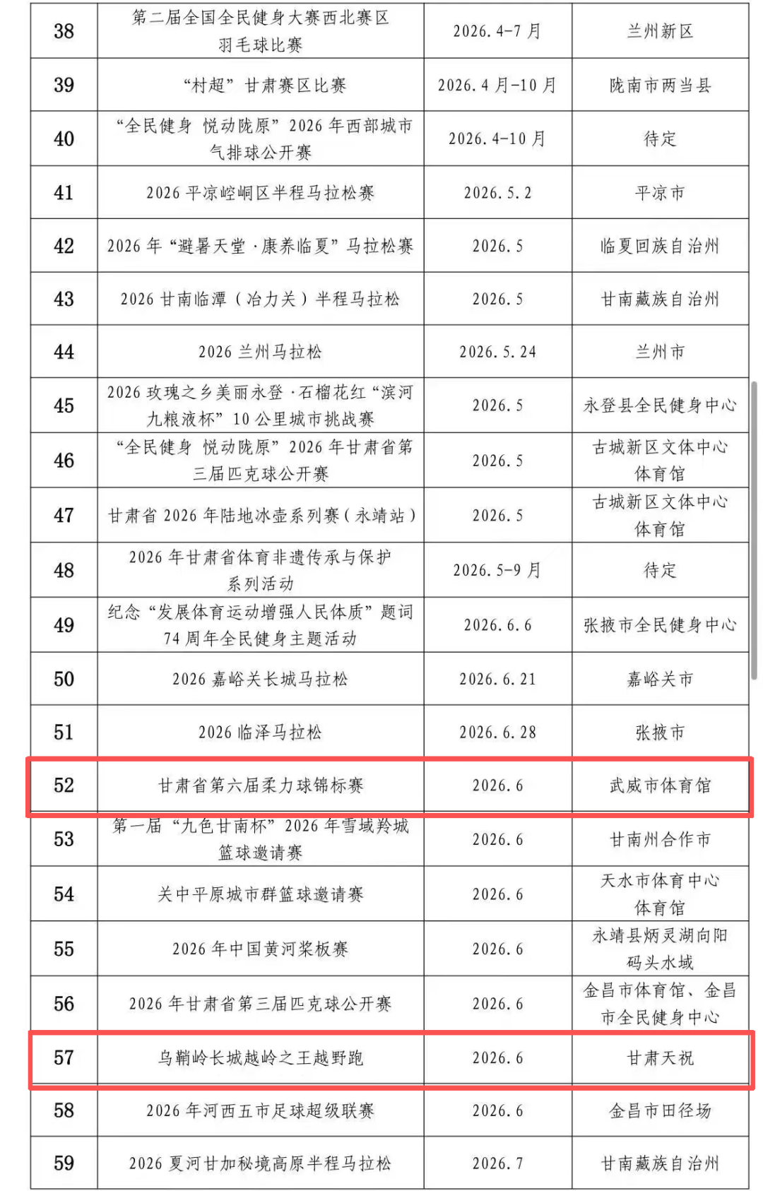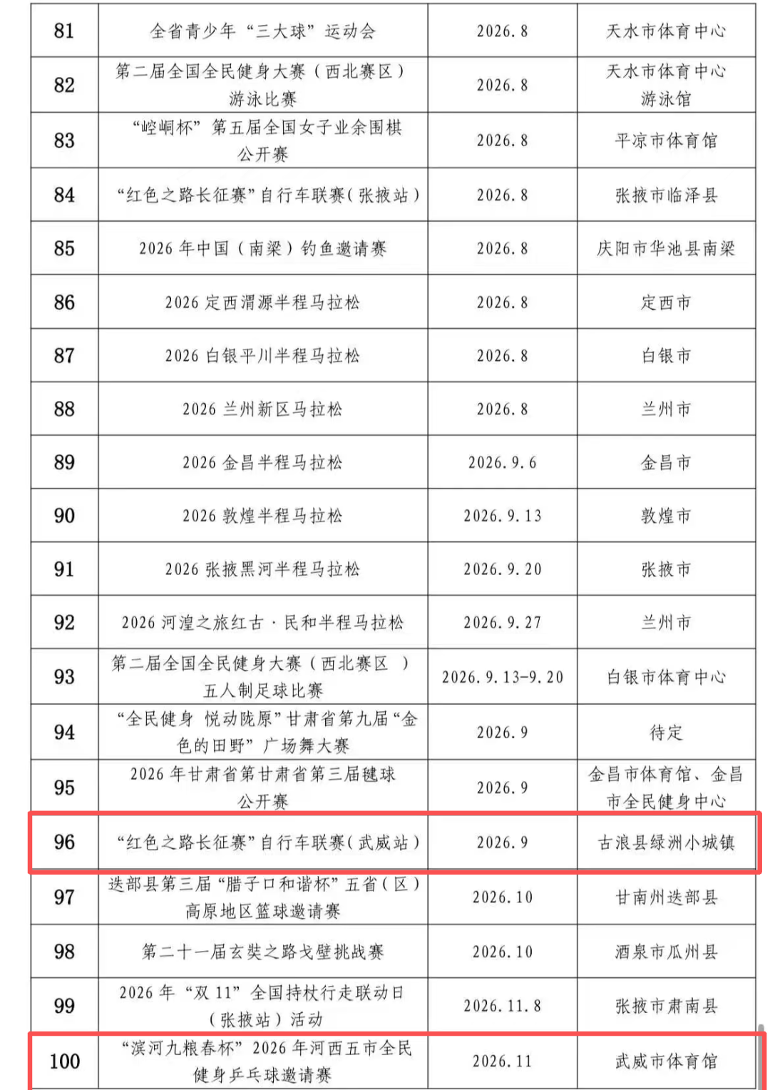 近日,省体育局、省文旅厅联合发布“跟着赛事游甘肃”2026年全省100项体育赛事目录,武威9项赛事入选,具体如下: